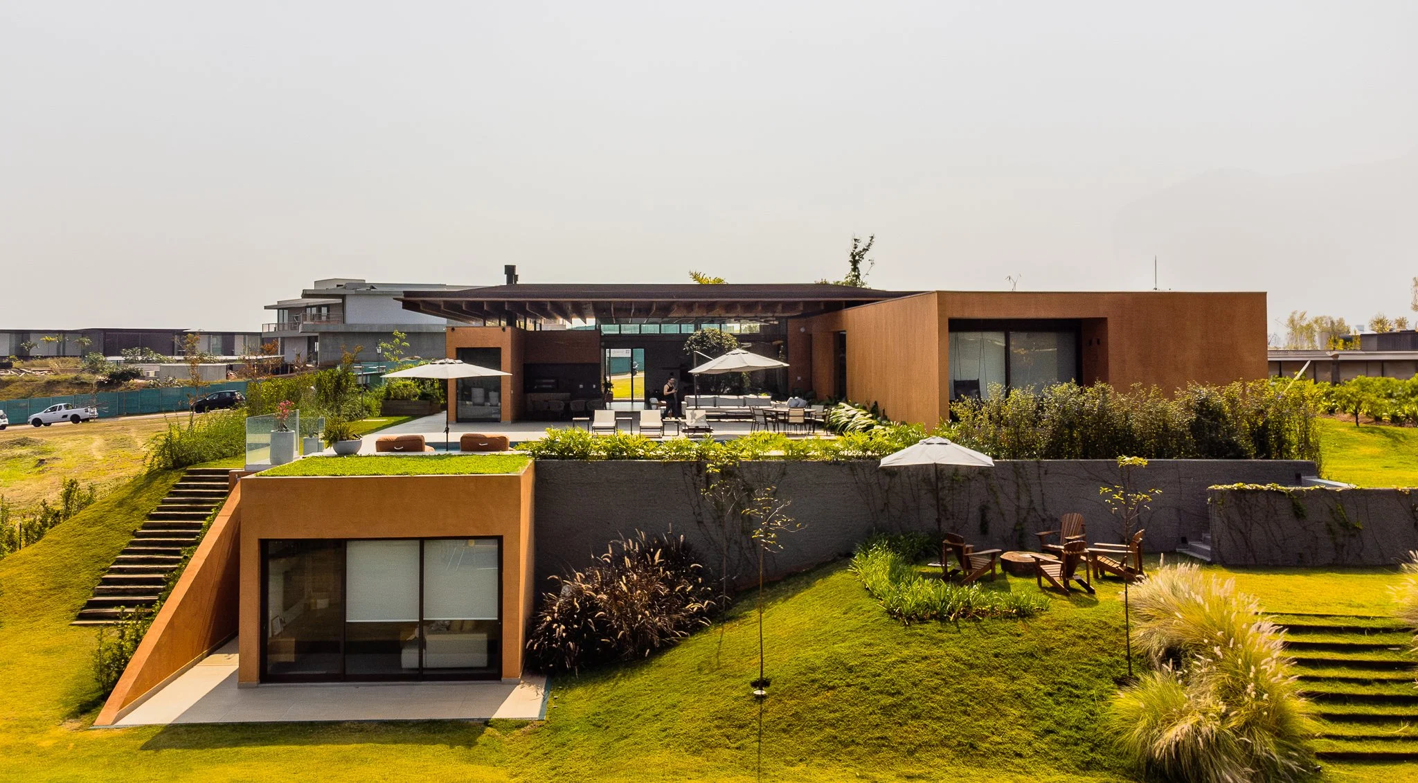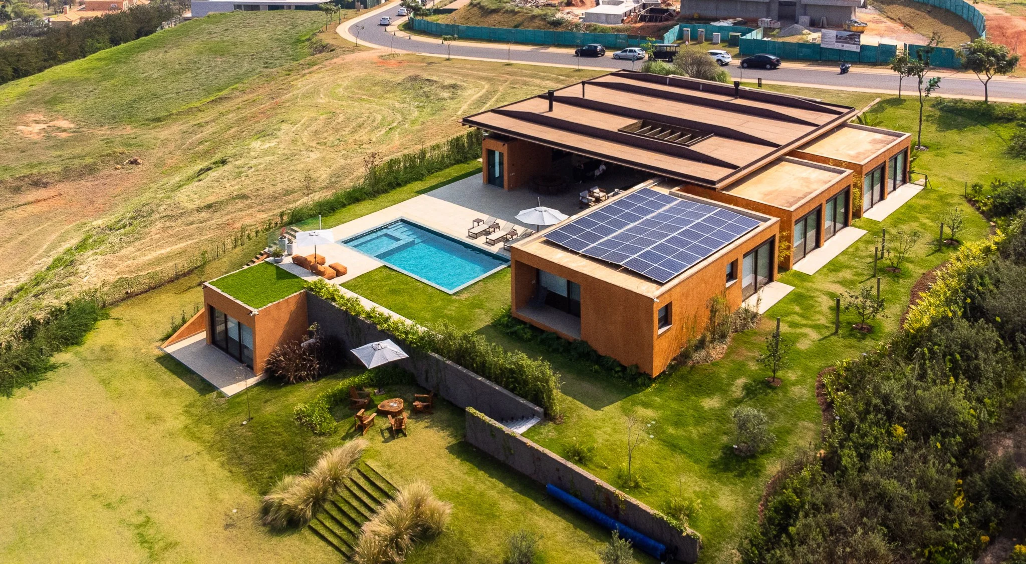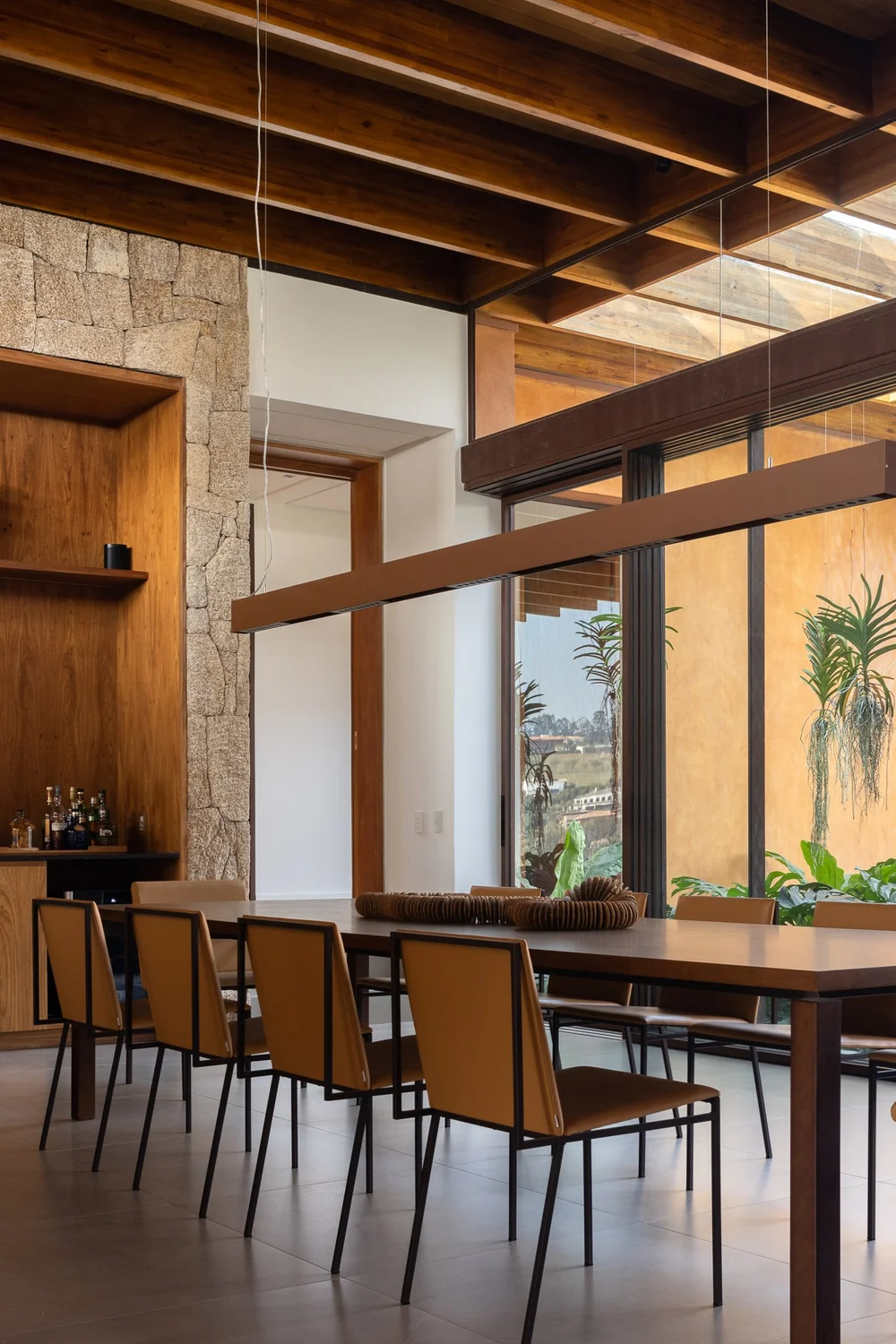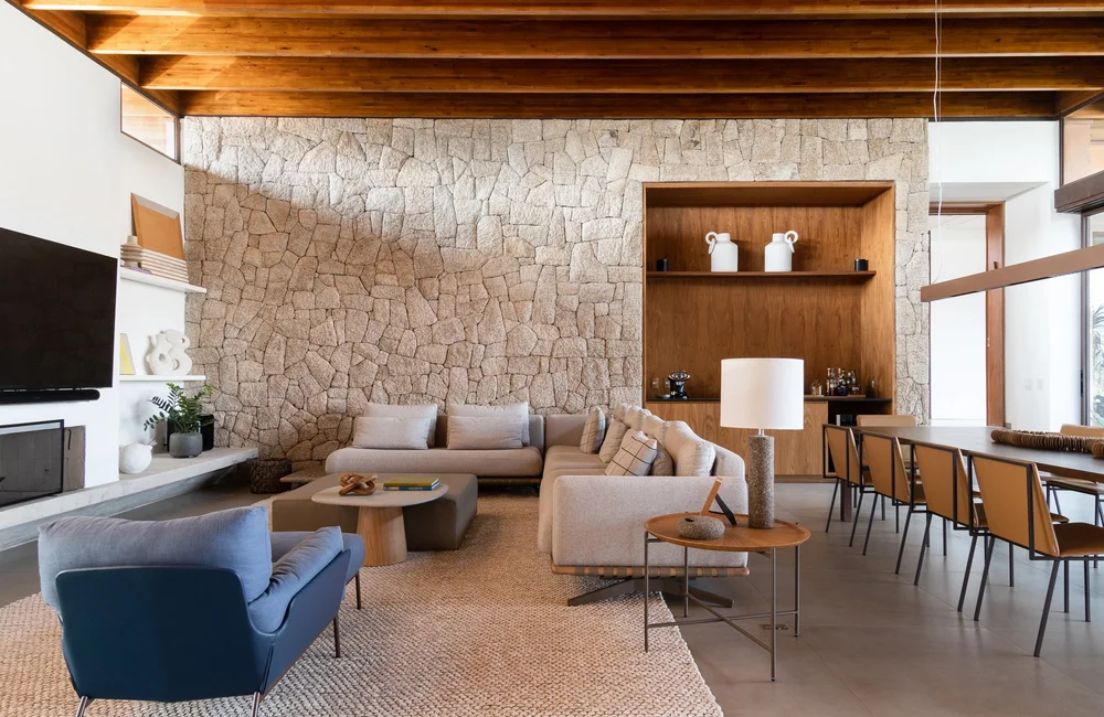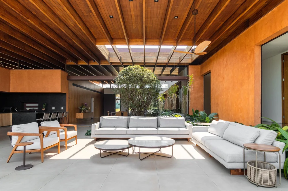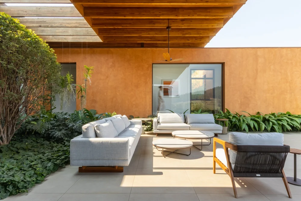 Descrição: Implantada em um terreno generoso de aproximadamente 3 mil metros quadrados em Itupeva, interior de São Paulo, a Casa da Grama foi concebida como uma residência térrea para uma família de cinco pessoas. Desde o início, o projeto buscou uma relação íntima com a paisagem e uma solução que valorizasse a fluidez entre interior e exterior.